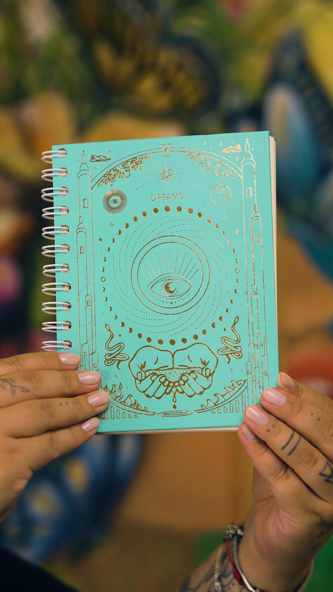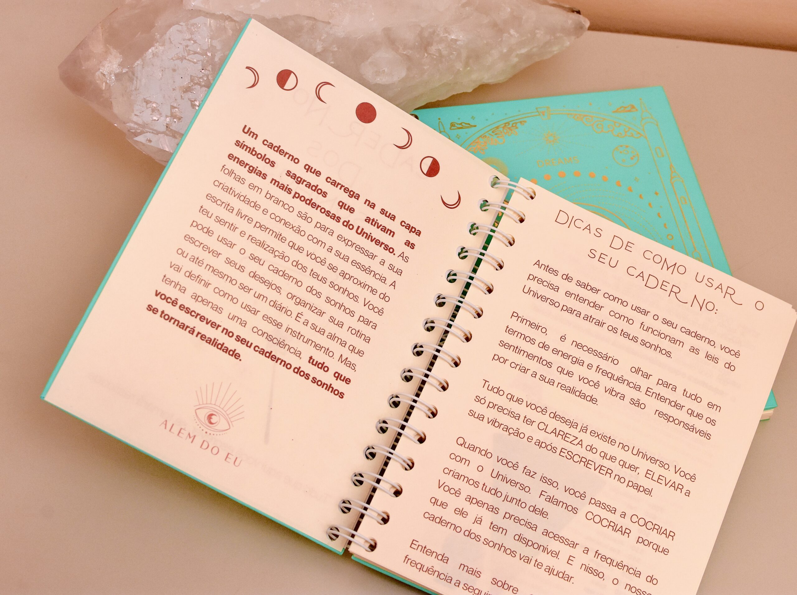 Um caderno mágico que contém sugestões de práticas para manifestar sonhos e intenções.